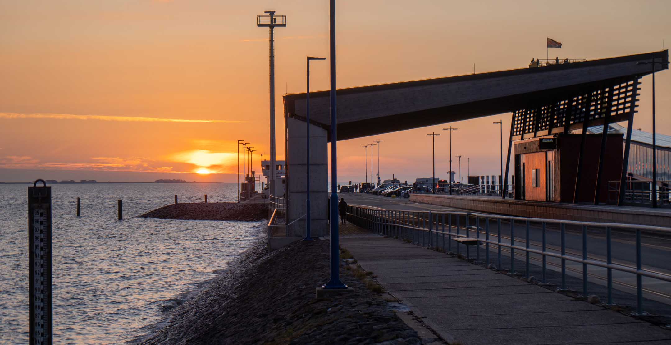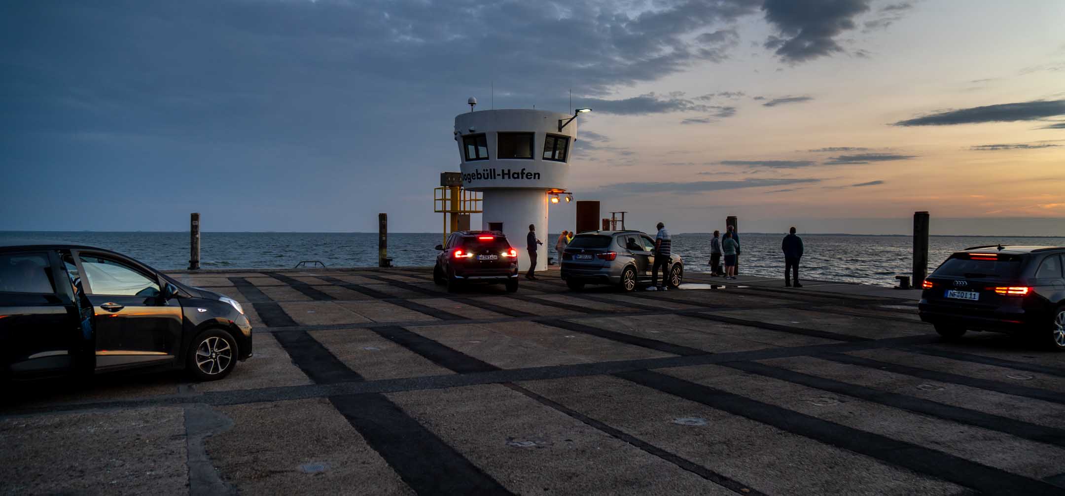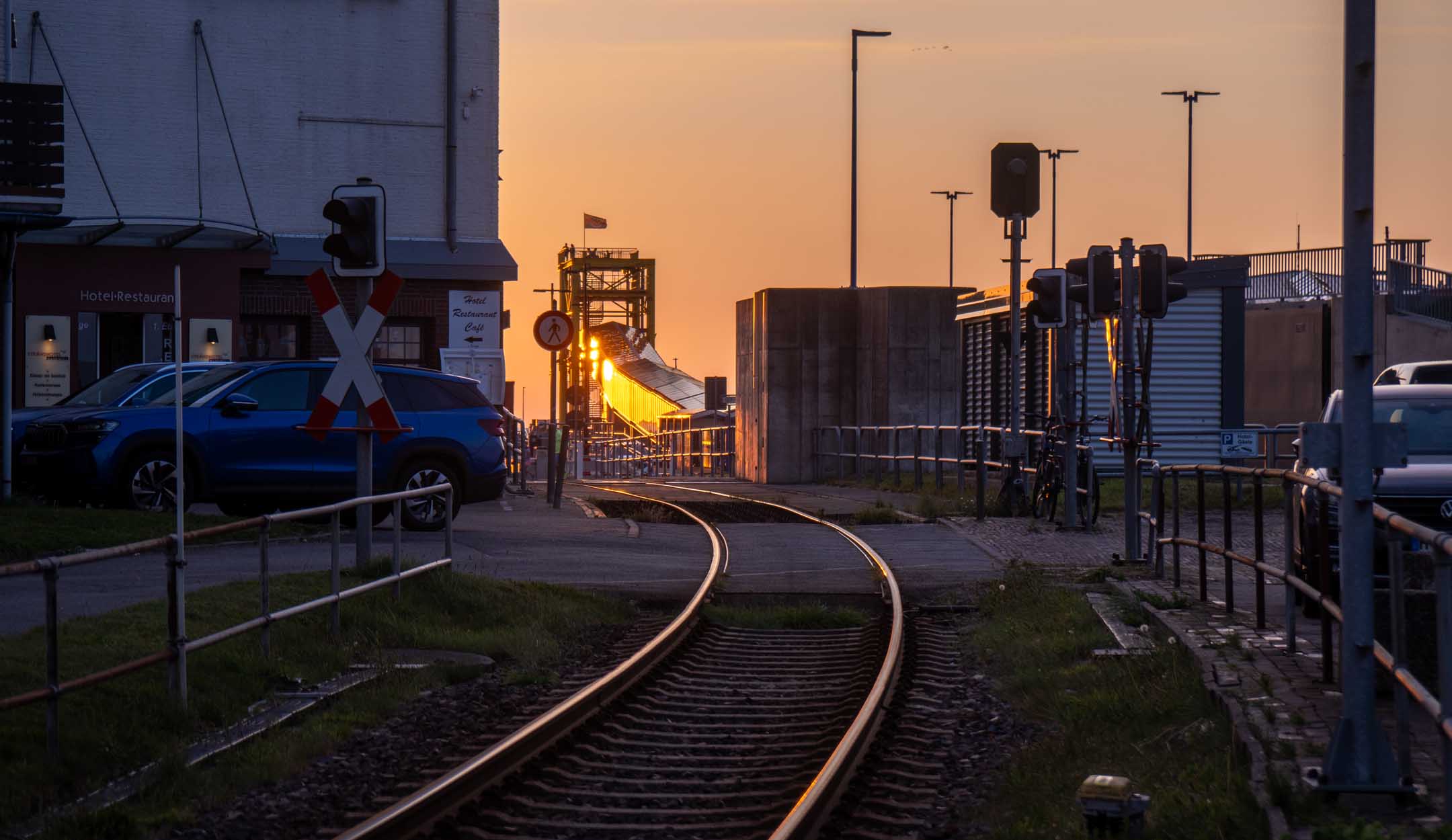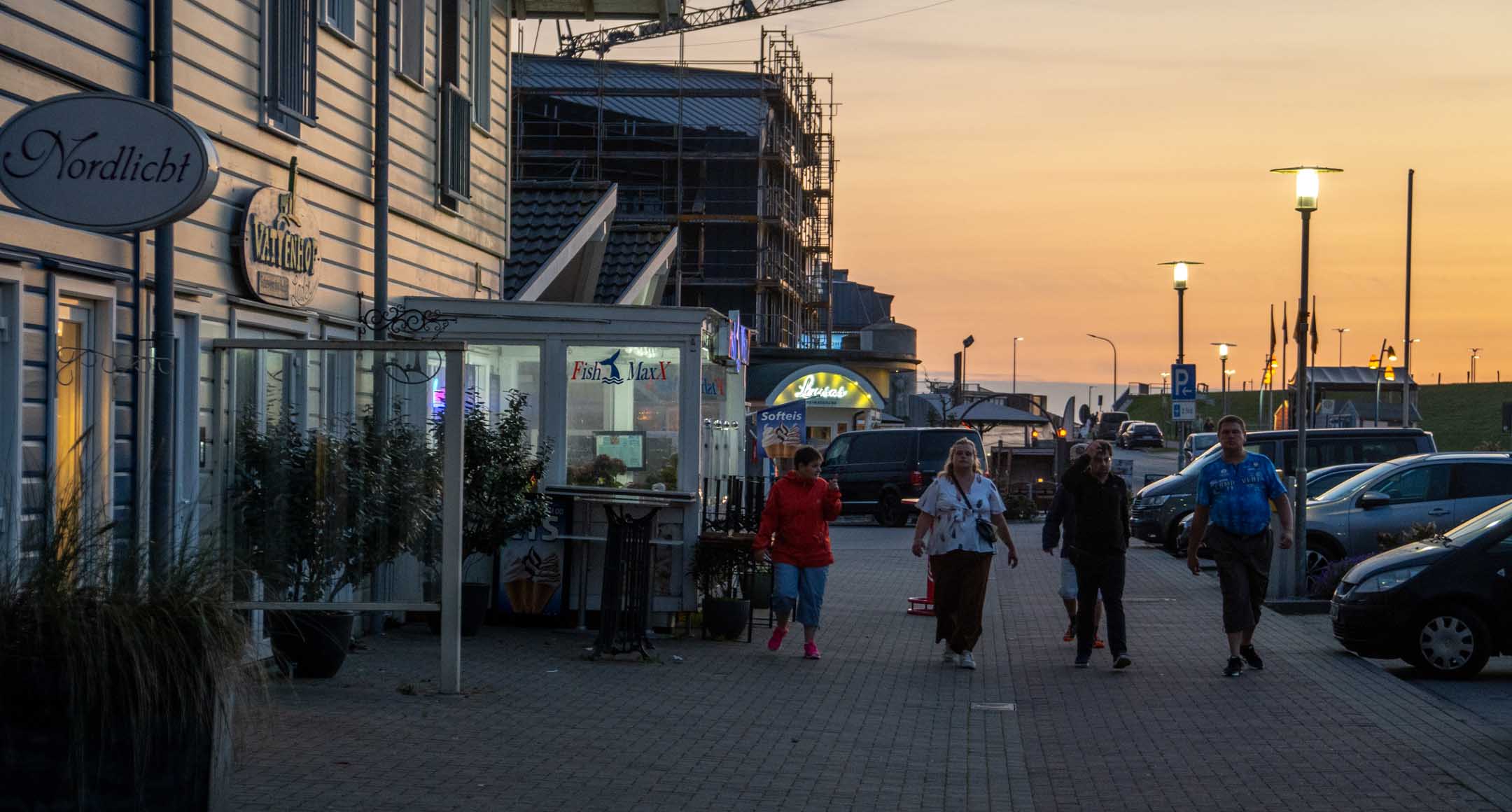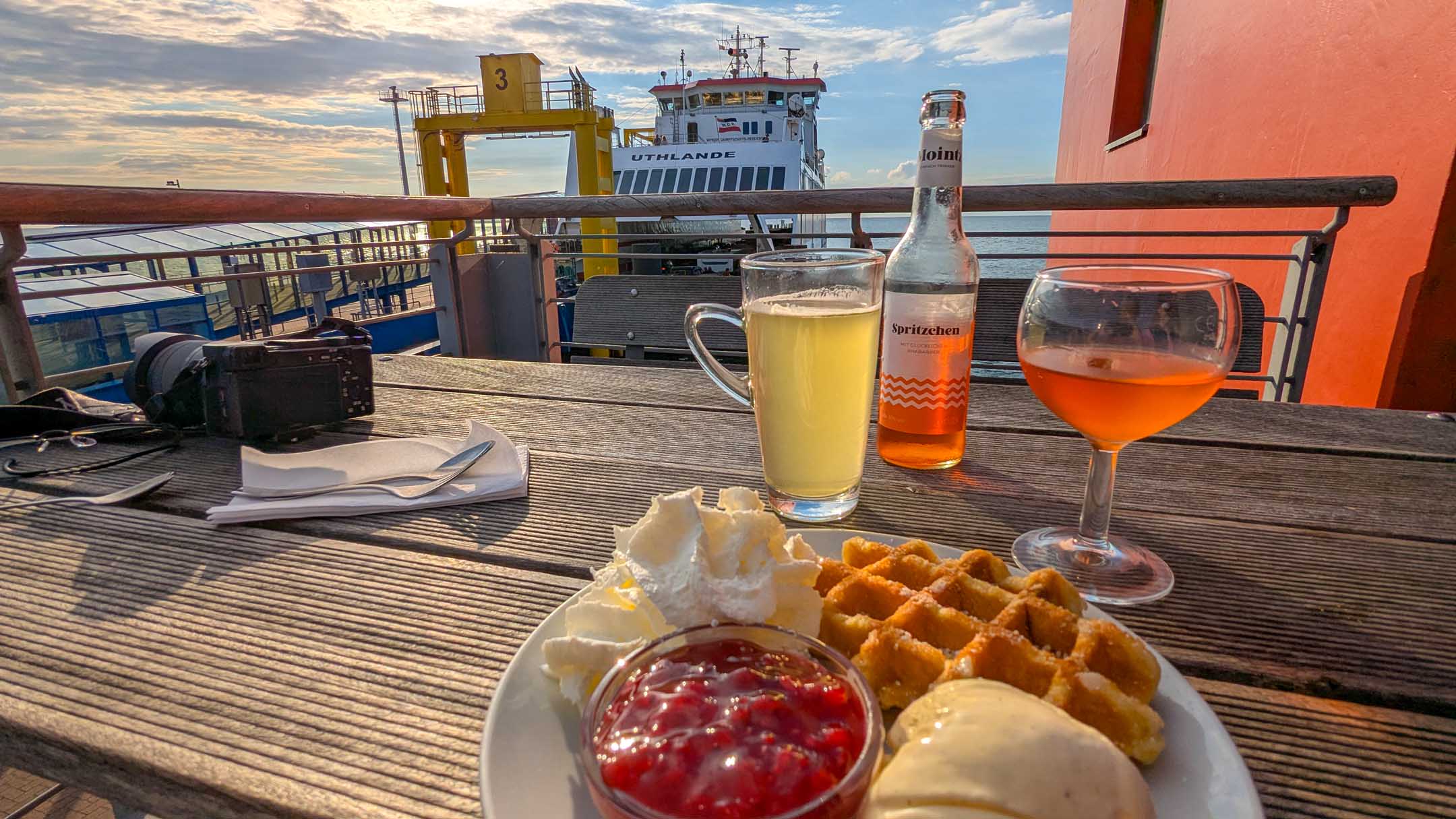 Das Hotel »Neuwaft« in Dagebüll entsprach den Erwartungen. Man hatte im Laufe der Zeit mehrere Gebäudekomplexe in 1970er/80er-Jahre-Optik, welche eine Art friesische Ländlichkeit darstellen sollte, zu einem begehbaren rustikalen Labyrinth verbunden, in welchem sich auch irgendwo unser Zimmer 118 verbarg. Uns zog es sofort zum Hafen mit Fährterminal mit aktiver Bahn-Mole. Hier ist immer was los. Dagebüll ist also erfreulicherweise per Bahn zu erreichen. Drei Firmen (NEG, Nah.SH und Deutsche Bahn tun sich zu einer Zweckgemeinschaft zusammen und schicken ab Niebüll einen gemeinsamen Zug nachDagebüll, mit 2 Wagen Nah.SH, 2 Wagen DB-IC und dazwischen ein Gepäckwagen von NEG. In dem fantastischen Reiseterminal von 2004 kehren wir regelmäßig und gerne ein, diesmal nicht drinnen mit Panoramablick über das Hafentreiben, sondern auf der Hochterrasse auf eine Belgische Waffeln mit mehreren Toppings. In der Auslage (leider nicht gekauft) drei Fischbrötchen der Premium-Klasse. Ja, im engeren Bekanntenkreis gibt es Menschen, die aktuell Fisch ab sofort für ihr weiteres Leben ausgeschlossen haben. Der bisherige Höhepunkt der Reise. Der Catamaran »Rüm hart« kam an, Kapitän und Kapitänin rollten eine Planke aus und verabschiedeten persönlich, lachend, scherzend, schulterklopfend die Fahrgäste. Großartig und in Erfüllung des namensgebenden friesischen Spruchs „Rüm hart – klar Kimming“ (bitte selber googeln, was das heißt). Den Hafenbereich verließen wir anschließend zum Abendessen auf der Dagebüller Ausgeh-Meile »Nordseestraße«. Am Nebentisch saßen 8 Dänen, die hier für ihre Verhältnisse spottbilig aßen, und nach der dritten Runde Bier diszipliniert blieben und nicht in krachendes Gackern verfielen. Über das Essen an sich breiten wir mal wieder den Mantel des Schweigens und des Vergessens. Auf der Mole wurde ein beachtlicher Sonnenuntergang erwartet und geboten. Touristen und Einheimische waren mit SUV’s und anderen Autos direkt an die Kante gekommen, um zu kucken und zu fotografieren. Wir fanden unser Zimmer, und die Nacht verlief ohne Zwischenfälle.