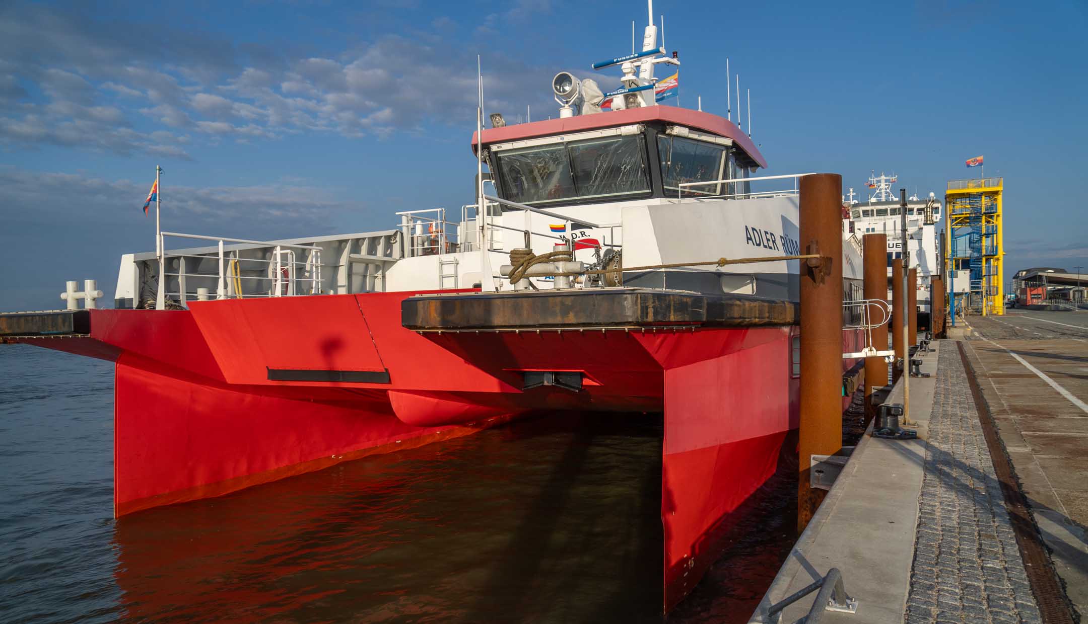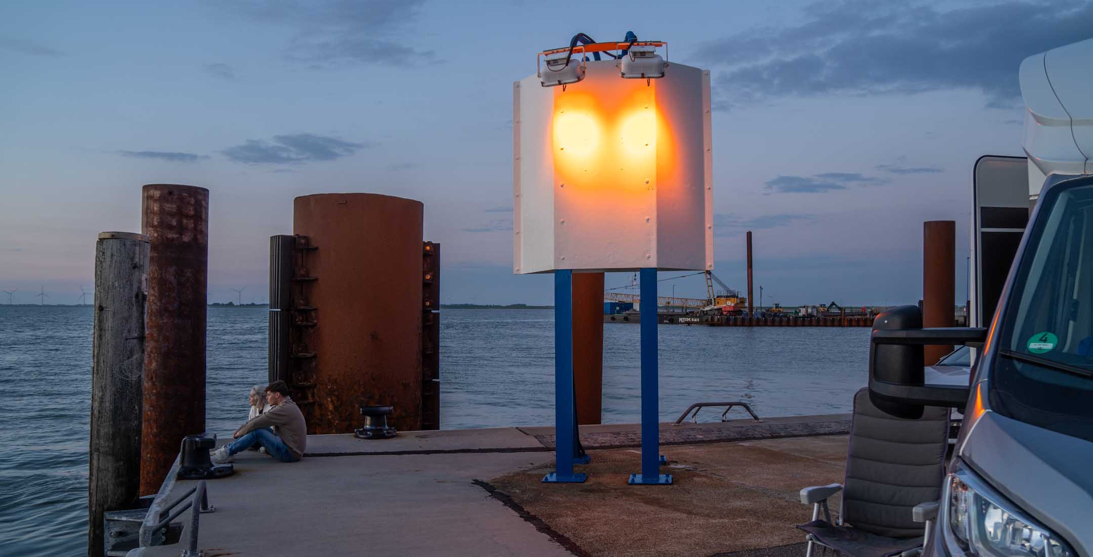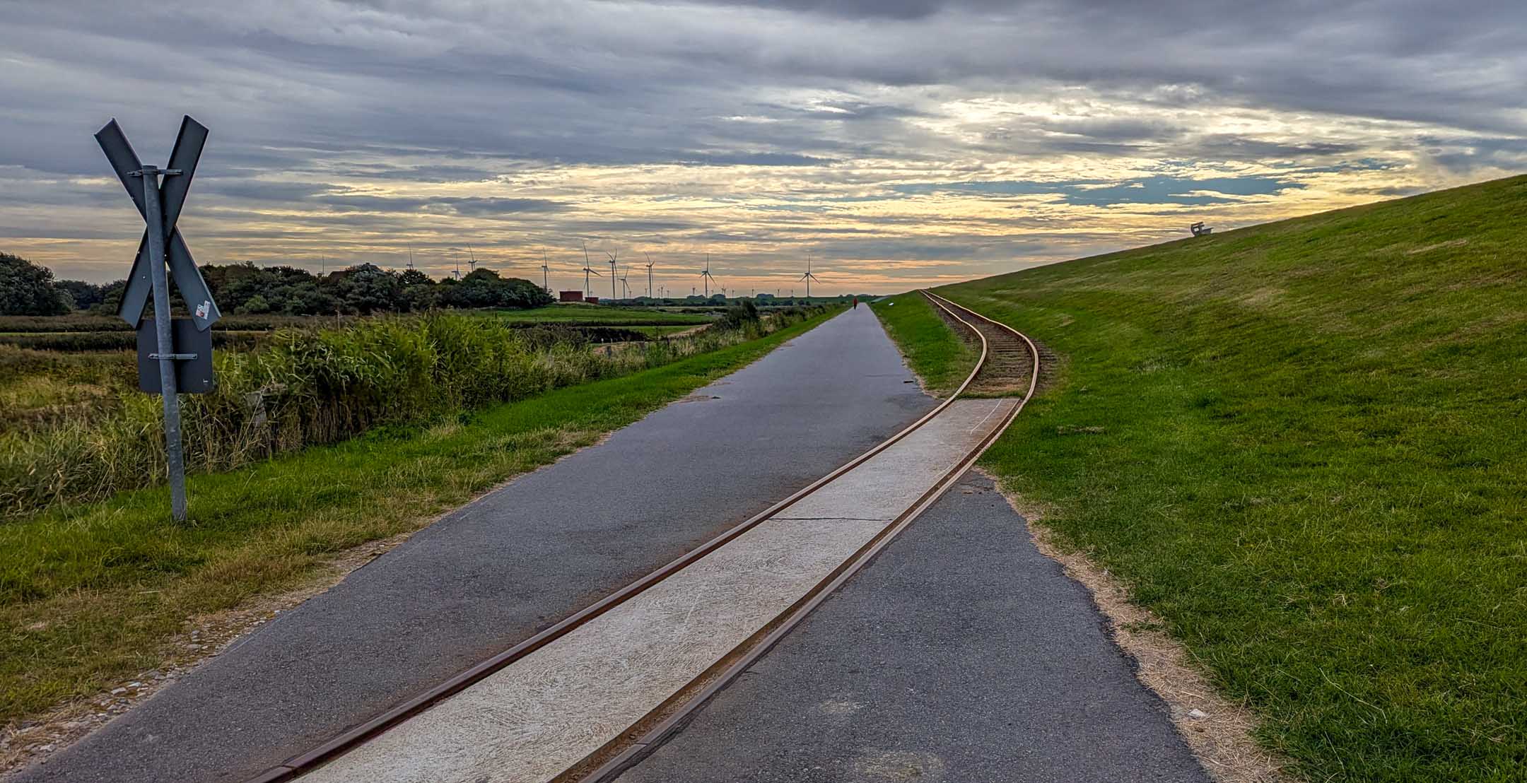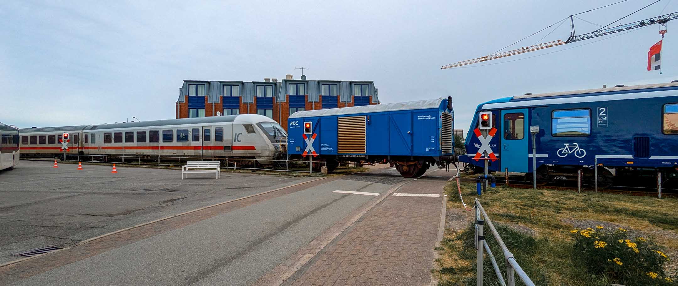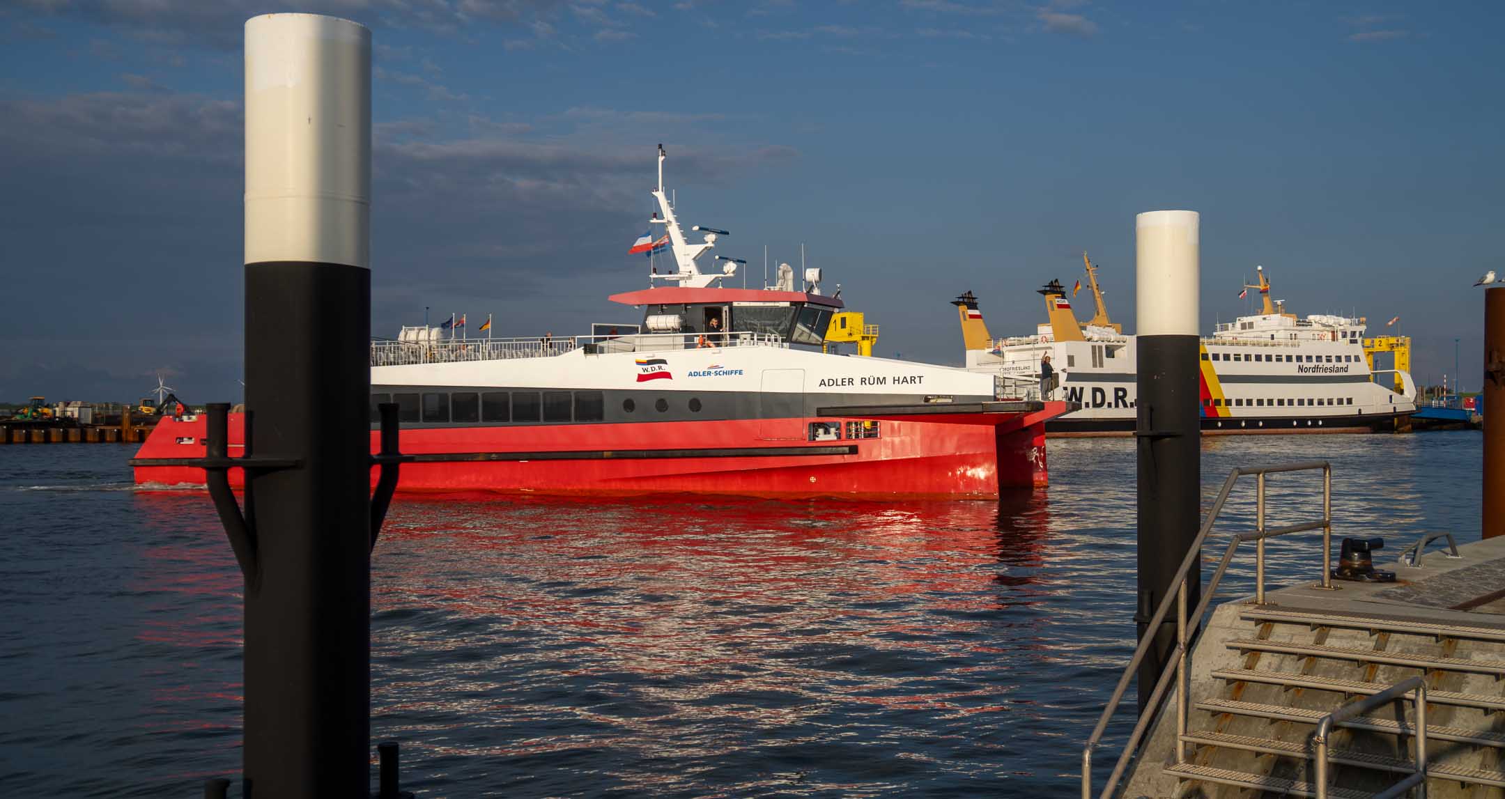 Das Hotel »Neuwaft« in Dagebüll entsprach den Erwartungen. Man hatte im Laufe der Zeit mehrere Gebäudekomplexe in 1970er/80er-Jahre-Optik, welche eine Art friesische Ländlichkeit darstellen sollte, zu einem begehbaren rustikalen Labyrinth verbunden, in welchem sich auch irgendwo unser Zimmer 118 verbarg. Uns zog es sofort zum Hafen mit Fährterminal mit aktiver Bahn-Mole. Hier ist immer was los. Dagebüll ist also erfreulicherweise per Bahn zu erreichen. Drei Firmen (NEG, Nah.SH und Deutsche Bahn tun sich zu einer Zweckgemeinschaft zusammen und schicken ab Niebüll einen gemeinsamen Zug nachDagebüll, mit 2 Wagen Nah.SH, 2 Wagen DB-IC und dazwischen ein Gepäckwagen von NEG. In dem fantastischen Reiseterminal von 2004 kehren wir regelmäßig und gerne ein, diesmal nicht drinnen mit Panoramablick über das Hafentreiben, sondern auf der Hochterrasse auf eine Belgische Waffeln mit mehreren Toppings. In der Auslage (leider nicht gekauft) drei Fischbrötchen der Premium-Klasse. Ja, im engeren Bekanntenkreis gibt es Menschen, die aktuell Fisch ab sofort für ihr weiteres Leben ausgeschlossen haben. Der bisherige Höhepunkt der Reise. Der Catamaran »Rüm hart« kam an, Kapitän und Kapitänin rollten eine Planke aus und verabschiedeten persönlich, lachend, scherzend, schulterklopfend die Fahrgäste. Großartig und in Erfüllung des namensgebenden friesischen Spruchs „Rüm hart – klar Kimming“ (bitte selber googeln, was das heißt). Den Hafenbereich verließen wir anschließend zum Abendessen auf der Dagebüller Ausgeh-Meile »Nordseestraße«. Am Nebentisch saßen 8 Dänen, die hier für ihre Verhältnisse spottbilig aßen, und nach der dritten Runde Bier diszipliniert blieben und nicht in krachendes Gackern verfielen. Über das Essen an sich breiten wir mal wieder den Mantel des Schweigens und des Vergessens. Auf der Mole wurde ein beachtlicher Sonnenuntergang erwartet und geboten. Touristen und Einheimische waren mit SUV’s und anderen Autos direkt an die Kante gekommen, um zu kucken und zu fotografieren. Wir fanden unser Zimmer, und die Nacht verlief ohne Zwischenfälle.