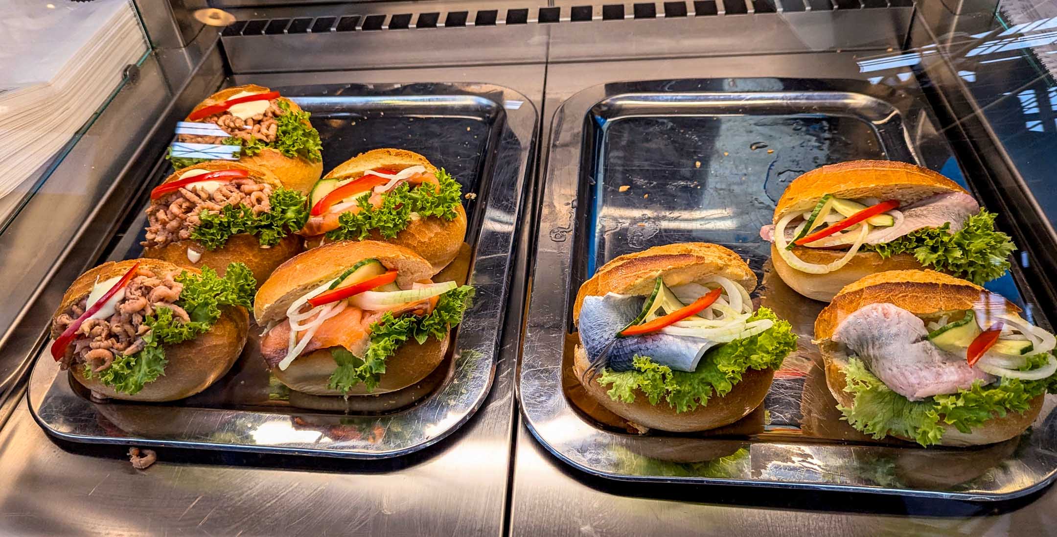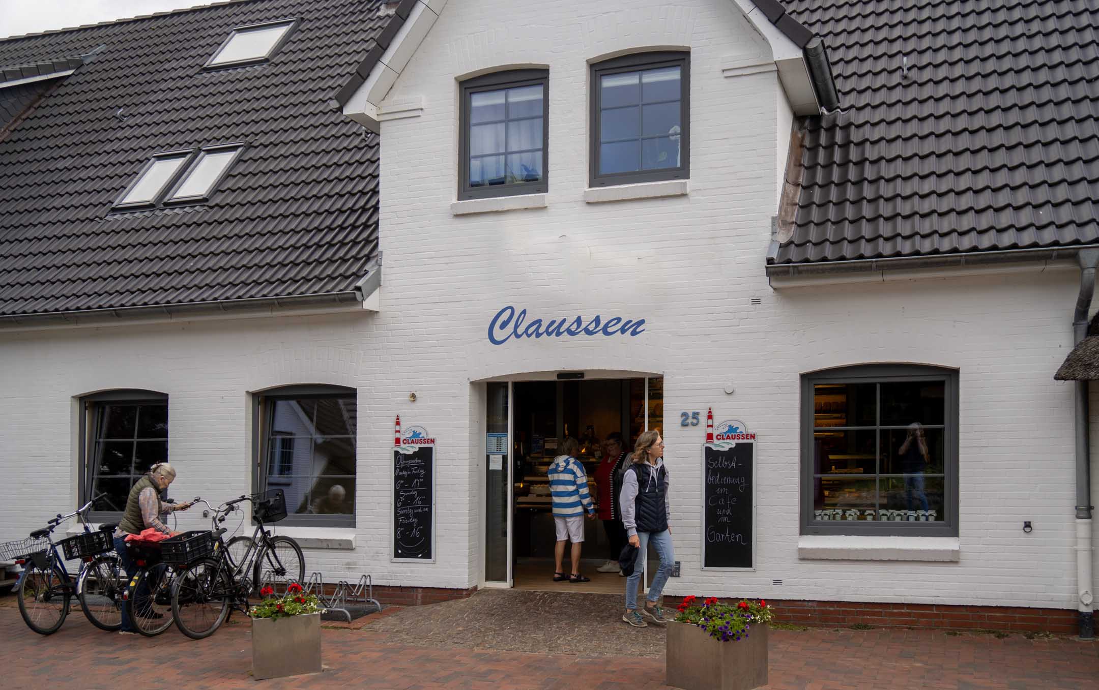 Auf das an dieser Stelle im Ablauf obligatorische Fischbrötchen verzichteten wir. Nach dem Desaster mit dem Fischbröthen 2024 in Norderney, welches hinterhältig von einer Möwe geraubt wurde, waren wir auf der Hut. Das sollte nicht wieder passieren, und am Strand von Norddorf hatten wir kein Fischbrötchen zur Hand. Wie „immer“, kam die Möwe im Sturzflug unbemerkt von hinten. Der erste Versuch ging noch 1:0 an die tapfere Mutter, beim zweiten Angriff gewann die Möwe. Diesmal selbstverständlich kein Fischbrötchen, sondern das von zuhause mitgebrachte Wurstbrötchen, ganz im Sinne von Ernährungswissenschaftlern, die nicht viel von Wurstbrötcchen halten. Eine Sttunde später : Die »Insel-Praline« (super Branding für ein kleines Café mit 3 Tischen) mit Kaffee/Kuchen ließen wir liegen, nun rächte sich der verfrühte Claussen- Besuch mit zuviel Kuchen im Vorfeld. Statt dessen ergab es sich aber, dass durch göttliche Fügung schräg gegenüber Fischbrötchen angeboten wurden. Die verbleibende Zeit bis zum Boarding und Start der Maschine um 15.15 war also gut genutzt. Zum Anbeißen duckten wir uns vorsichtshalber. Auch Preise nennen wir hier bewusst keine.
