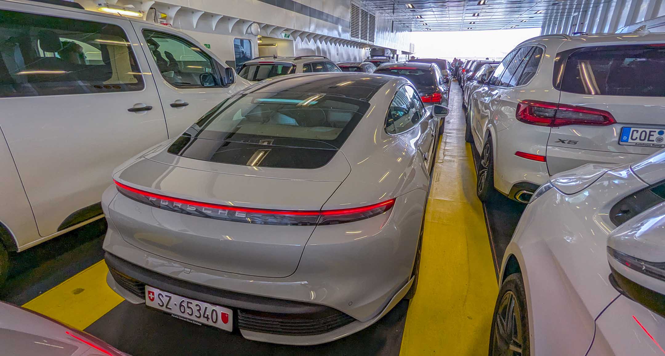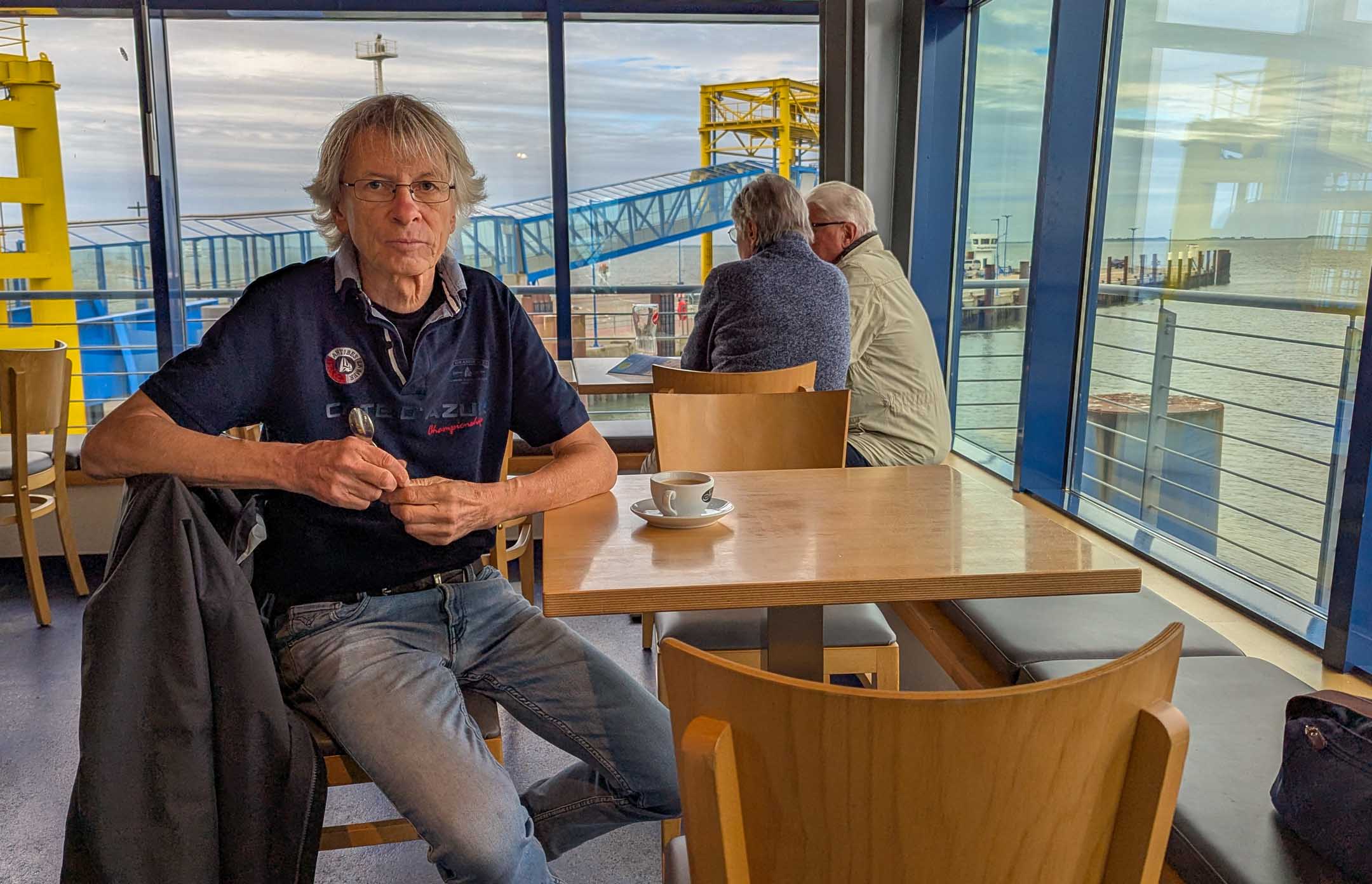 Da die Abfahrt nach Föhr erst für 10.40 Uhr gebucht war, wollten und konnten wir das karge Frühstück durch Beobachtungen des geschäftigen Treibens im Saal in die Länge ziehen. Bei Hotel-Frühstücken haben wir uns angewöhnt, auf Bekannte zu achten, bzw. auf deren Epigonen. So saß am Nebentisch vermeintlich der Paderborner Hobby-Fotograf Karlheinz Voßkamp. War er es oder nicht ? Draußen auf dem Parkplatz gerieten wir mit netten Osnabrückern ins Gespräch. Sie kamen in Wirklichkeit aus Bramsche, hatten eine Woche Hotelurlaub in Dagebüll hinter sich und versuchten, uns die Anschaffung von E-Bikes ans Herz zu legen. Sie fuhren einen uns unbekannten, nagelneuen Audi der A- oder Q-Klasse, Verbrenner oder E war auf die Schnelle für uns Nicht-Audianer nicht auszumachen. Wir hatten noch Zeit und wanderten am Deich entlang nach Süden bis zum Kreuzungspunkt, wo die Lorenbahn über den Deich hinweg ins Wattenmeer verschwindet auf ihrer langen und beschwerlichen Reise zu den Halligen, bei glühender Hitze oder schwerer Sturmflut. Es fuhr grade keine. Im Terminal war dann noch Zeit für einen Kaffee. In der Warteschlange neben uns entdeckten wir einen Porsche Taycan mit Nummernschild des Kantons Schwyz. Wir nahmen uns vor, im Auge zu behalten, wo in Föhr dieser Schweizer wohl abbleibt. Bestimmt nicht im Hochhaus Uthlande.
