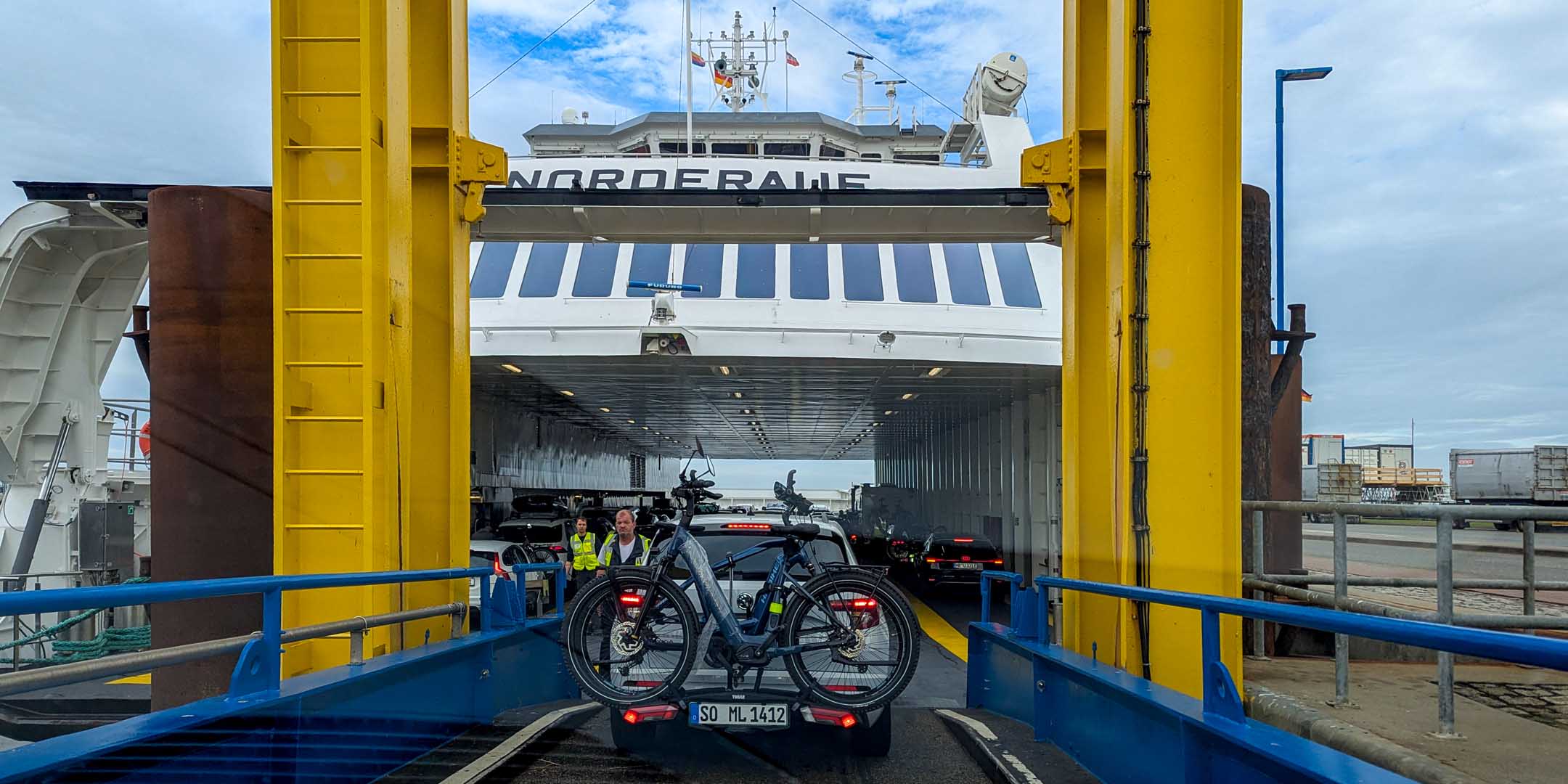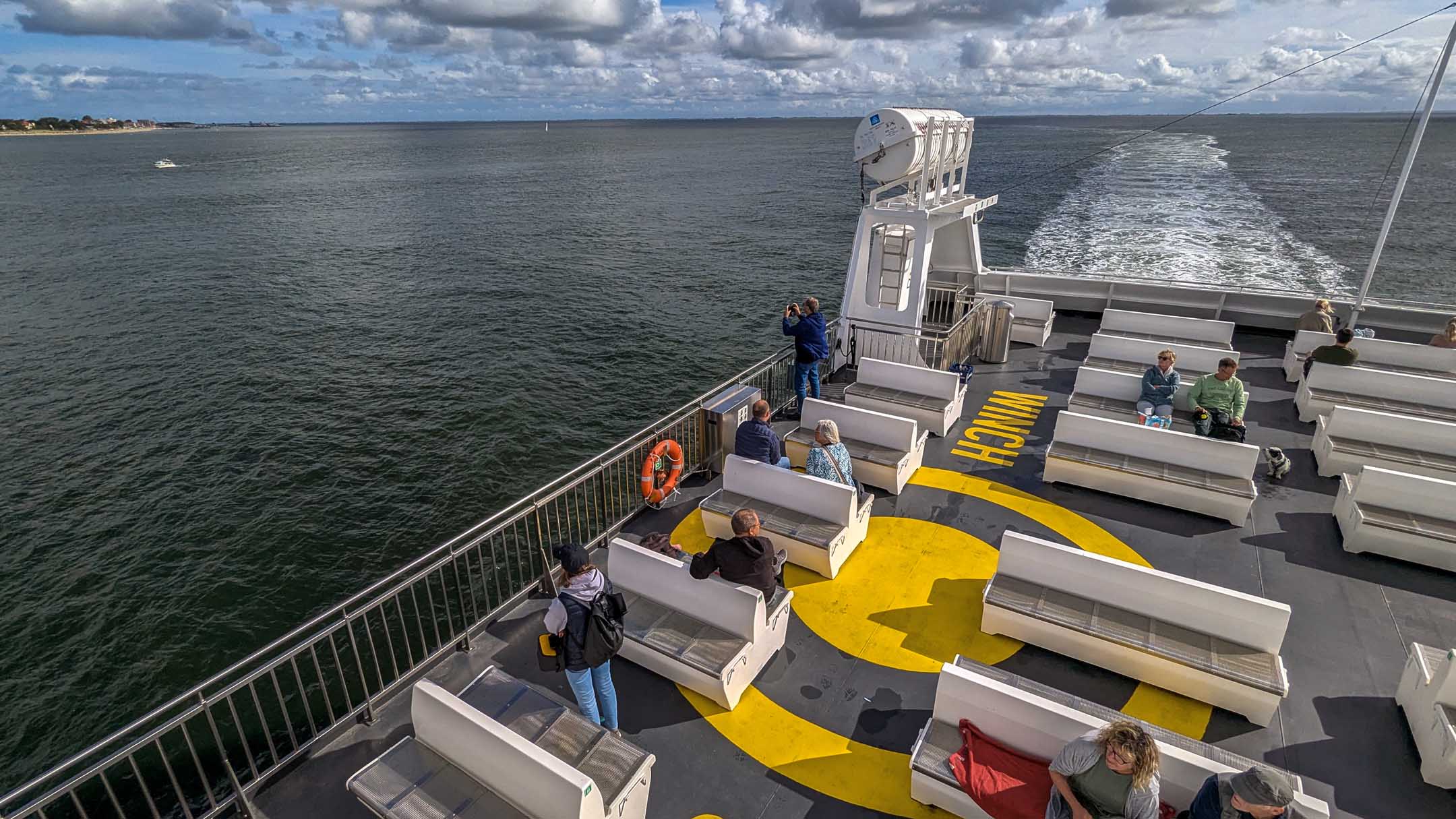 Nur wenige Pasagiere erkannten wir von der Hinfahrt wieder, unter anderem einen Schäfer mit seinem (zu?) ängstlichen Hund. Er hatte den Amrumer Teil seiner Herde besucht. Die Geschwindigkeits-Mess-App ließ sich von Km auf Knoten umschalten, und siehe da: 8 Knoten Speed im Wattenmeer lagen drin. An Bord ging es ruhig zu. Kaum Autos, eine Handvoll Fahrräder. Wir stellen immer wieder fest, dass das Fährpersonal auf der Teilstrecke Wittdün–Föhr–Dagebüll nicht so locker und liberal drauf ist, wie auf anderen Strecken. Obwohl das ganze Schiff fast leer war, mussten wir die Fahrräder auf einen Haufen mit den Rädern anderer Leute werfen. Dabei verhakte sich unser Rücklicht-Kabel und riss ab. Ein Video von einer durchgeführten und dank der Leere ermöglichten Radtour auf dem Deck hatte leider nichts aufgezeichnet. Das ist sehr sehr schade. Wir lieben solche spontanen Micro-Radtouren im Sekunden-Bereich.