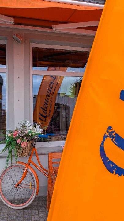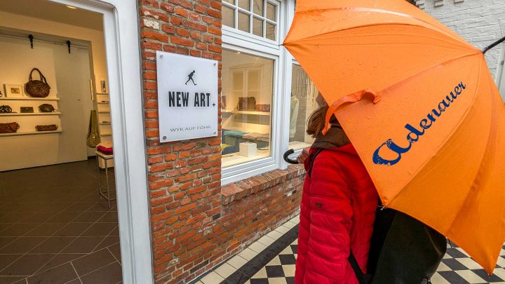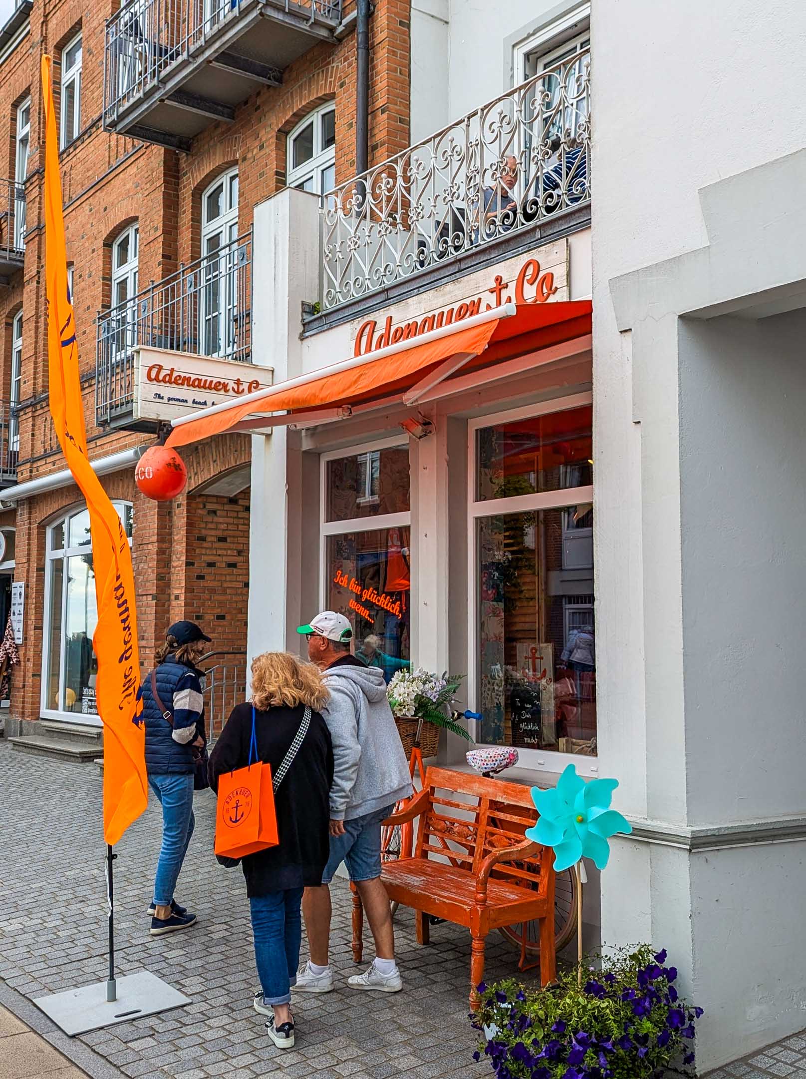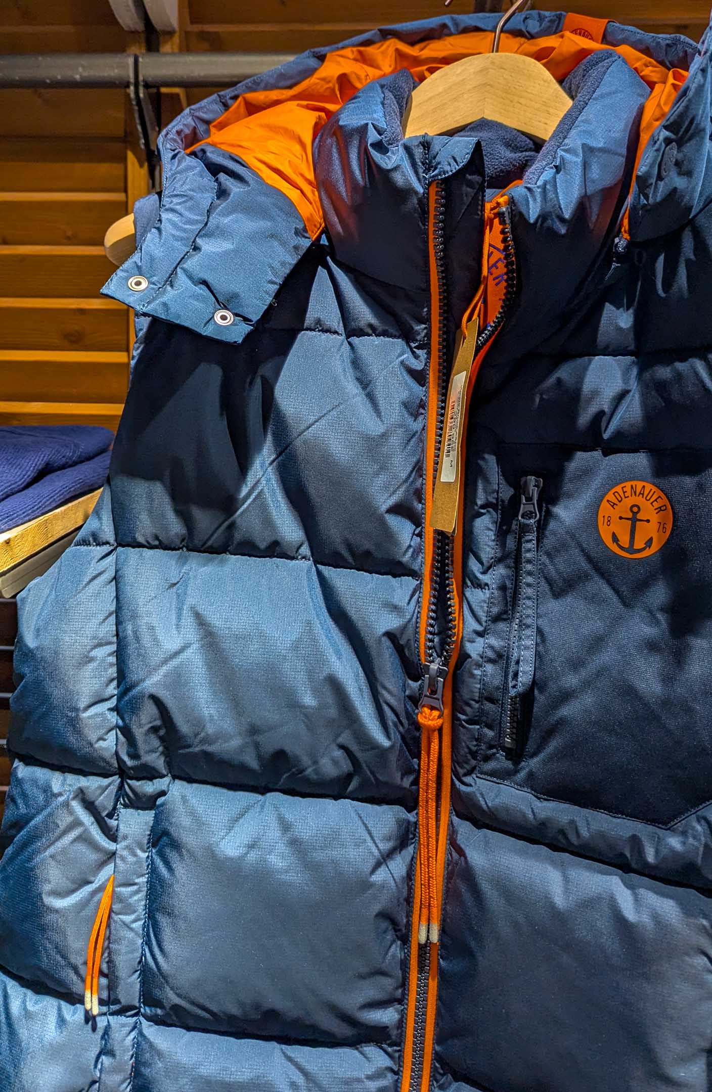Magisch angezogen fühlen wir uns in allen Urlaubsorten im Norden von Adenauer. Das ist nicht der knorrige Alt-Kanzler aus Rhöndorf, sondern eine Boutiquen-Kette : Jung, sportlich, cool, maritim, nicht unpreisig und blau-orange. Erstmals seit Jahren haben wir so einen Laden betreten und sofort eine gesteppte Kapuzen-Weste ins Auge gefasst, für nur 299,00 €. So billig kommt man bei Alt-Wyk nicht davon.