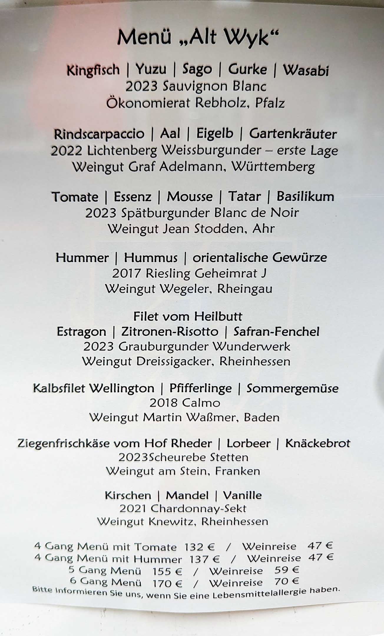 Ein bleibendes Faszinosum in Föhr ist für uns immer wieder die Speisekarte des Restaurants »Alt Wyk« in der Großen Straße. Man kann aus 8 Menügängen wählen: