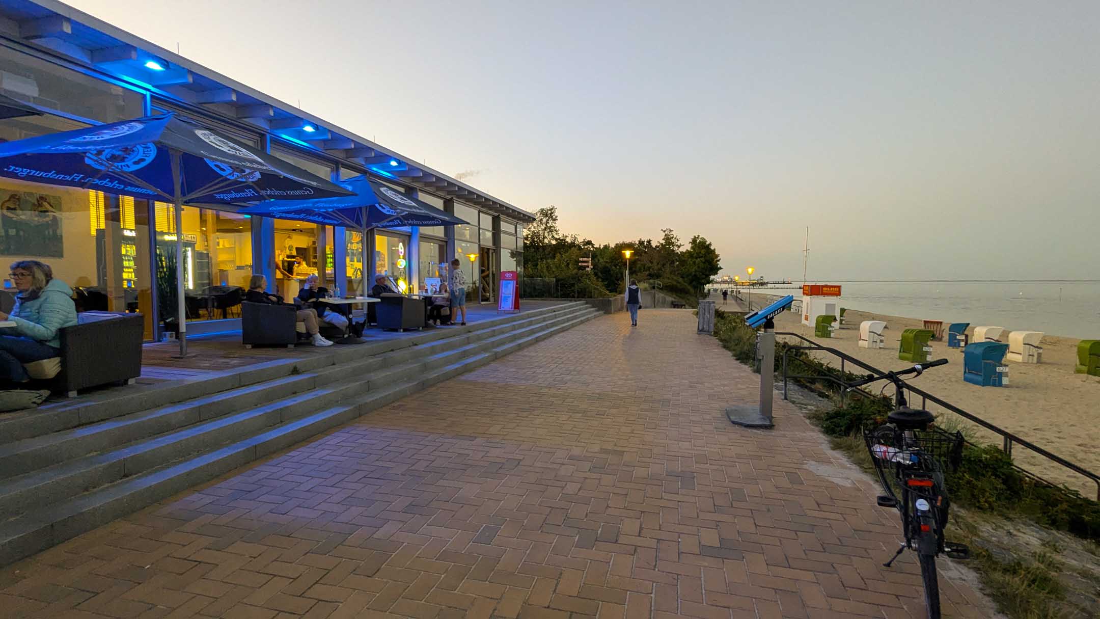 Nach einer ausgedehnten Pause machten wir uns in die beginnende Dämmerung hinein auf eine Extra-Tour auf der Strandpromenade bis zum Hafen und zurück, ohne Einkehr, obwohl noch erstaunlich viel „auf“ und „los“ war, u.a. Bübchens Milchbar. Im Kurpavillon spielte eine 4er-Band bewährte Schlager vom Typ Wolfgang Petry/Andrea Berg bzw. Nachfolge-Künstlern dieses Genres.