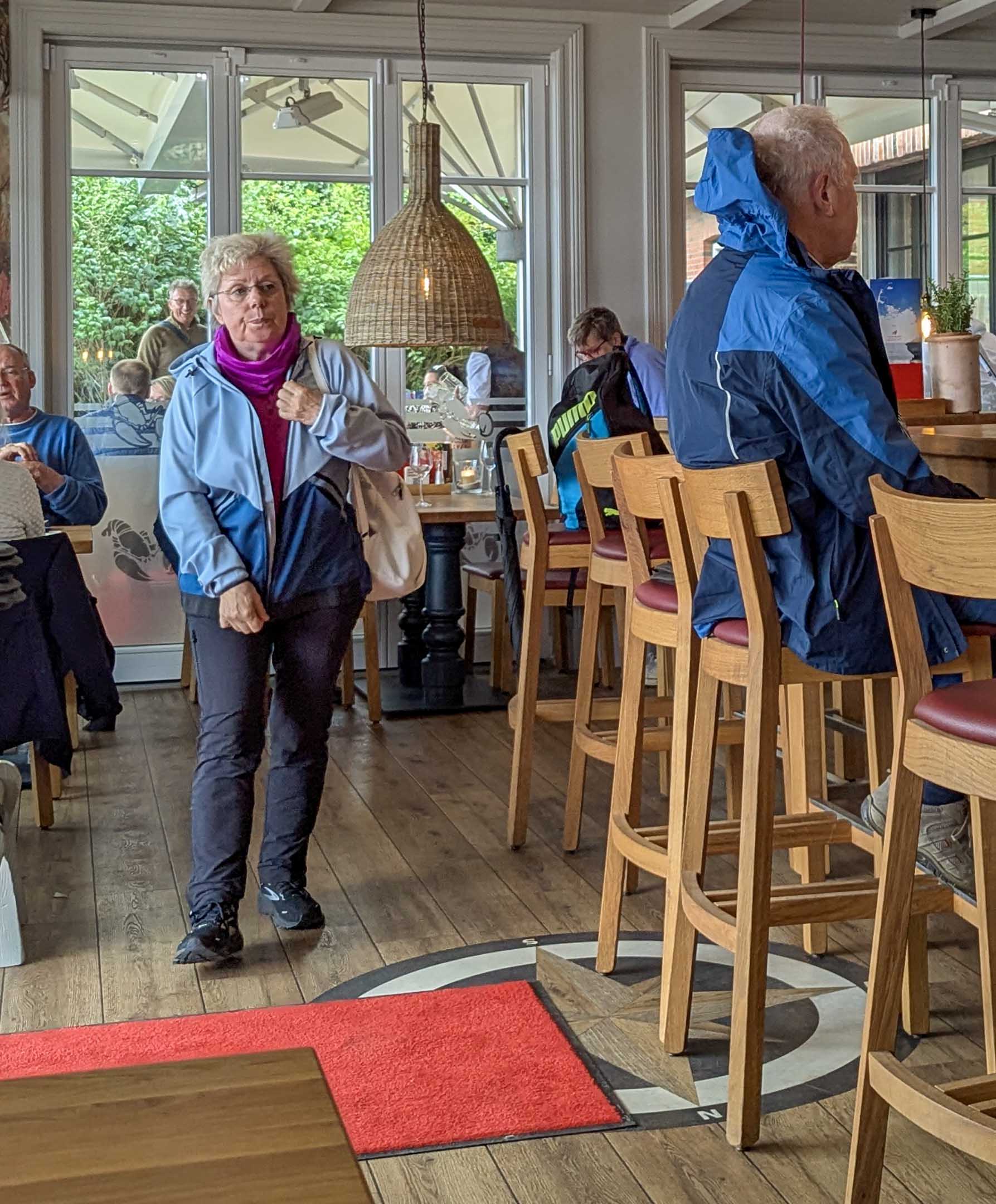 Auf dem Rückweg kehrten wir bei Aquamarin ein (direkt am etwas runtergekommenen bzw. seit Jahren angekündigt abgängigen Hallenbad Aquaföhr). Toller Blick, gutes Sitzen, aber spürbar muffelig-ignorant bei null Service. Wir mussten selbst das Geschirr der Tisch-Vorgänger abräumen, entsprechend pendelte sich das Trinkgeld ein. An den Nebentischen wurden Pizzen serviert, aber jeweils nur zu 1/3 aufgegessen.