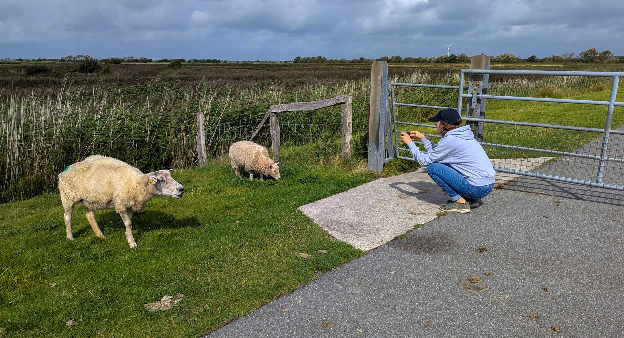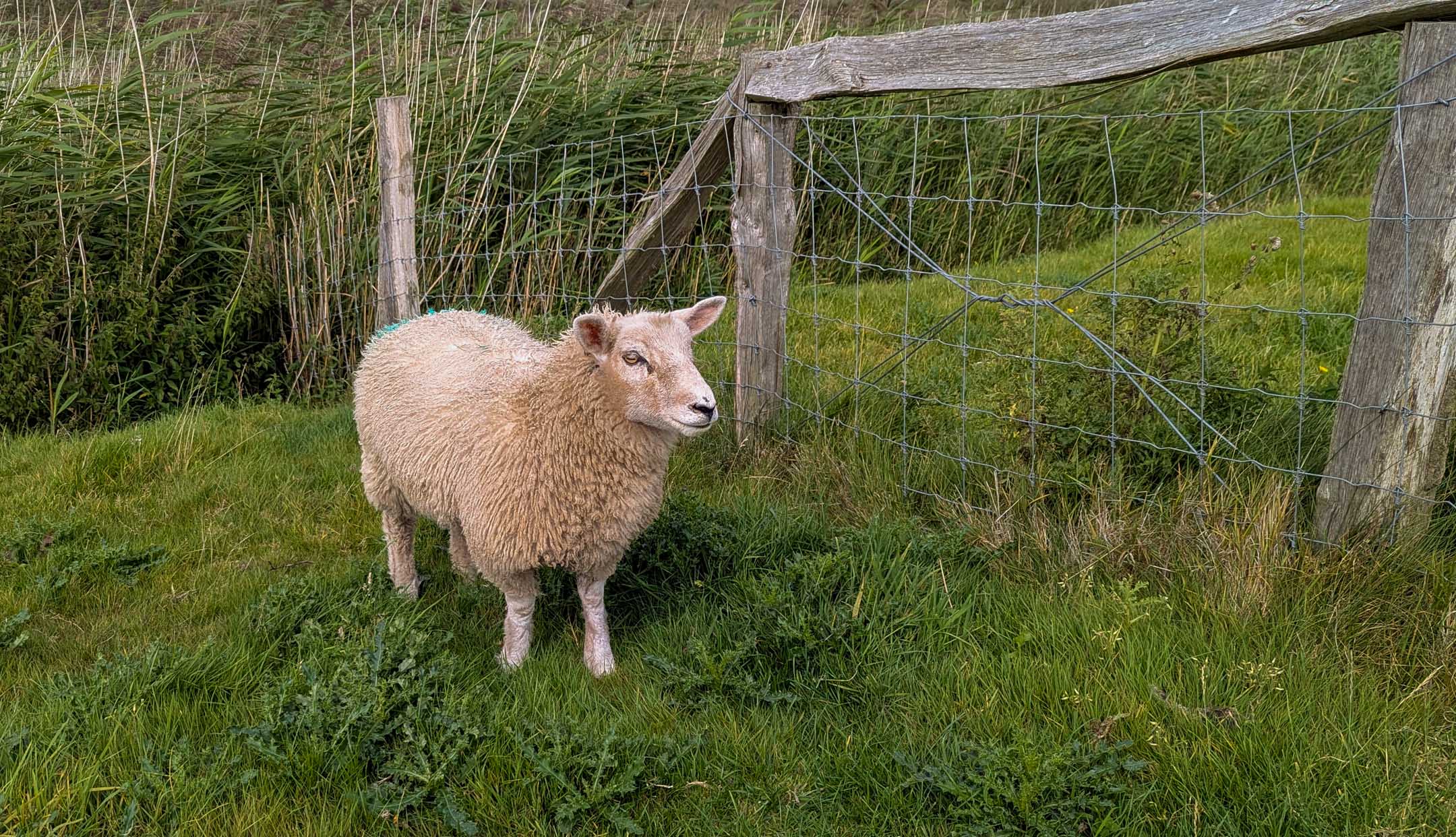Das Wetter hatte sich wieder sehr beruhigt. Nicht alle würden es als Hochsommer bezeichnen, wir aber schon. Wo sollte es heute hingehen ? Nach dem Besuch des „Haus des Gastes“ in Utersum am Dienstag eine schwierige Frage. Eigentlich könnten wir wieder abreisen. Aber was solls. Spontan radelten wir nach Nieblum, ohne dort Verrichtungen vorzunehmen. Windmäßig lief es zwischen Nieblum und Alkersum sehr gut, genauer gesagt, wie ein Möppken. (Ja, wir wissen, eigentlich heißt es „Döppken“). Morsum/Oevenum lagen an der Strecke. Es zog sich hin, und es gelang uns nicht, auf den Weg jenseits des Deiches direkt am Ufer zu gelangen. Statt dessen nahmen wir mit dem viel befahrenen Weg hinter dem Deich vorlieb. Die Mutter hatte eine Viertelstunde damit zu tun, dem nicht abreißenden Strom der Radler das Schafsgatter aufzuhalten und gleichzeitig aufzupassen, dass zwei Schafe nicht die Gelegenheit zum Abhauen nutzten. Im Rahmen der Tour sollte eine Einkehr stattfinden, vorzugsweise bei Bübchens Milchbar, die natürlich geschlossen hatte. Bei Café Steigleider und dem Inselcafé als dritte Wahl waren zum Glück schon alle Tische besetzt. Glenngelato machte das Rennen. Eine weitere Runde nach Feierabend zu Fuß mit Umweg durch das Wattenmeer führte uns auf ein BMW zu Aquamarin.