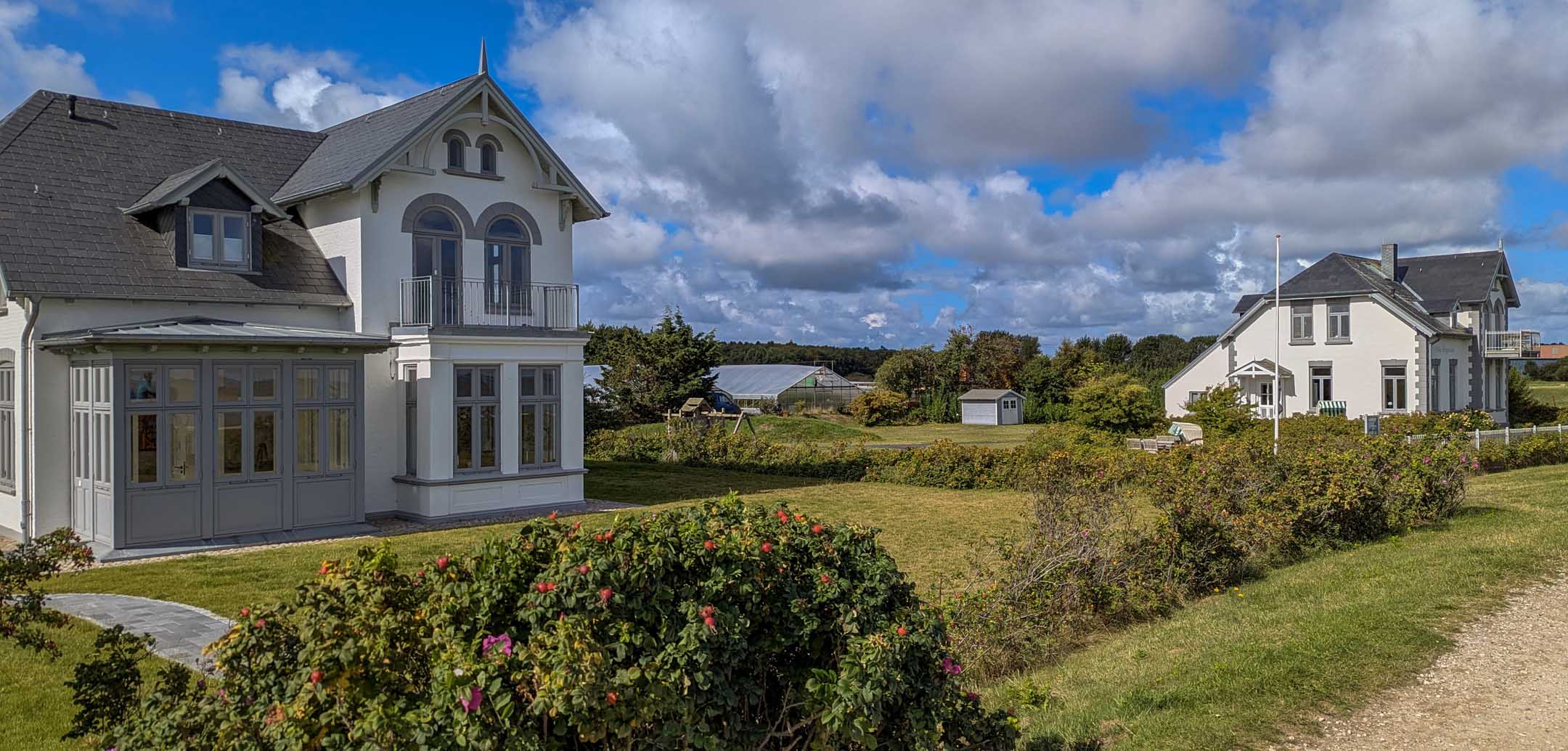 Kurz nach neun klarte es unerwartet auf. Wir disponierten um. Nun war Gelegenheit, die traditionelle Radtour nach Amrum zu veranstalten, ist auch billiger (38 statt 112 €). Gesagt, getan. Diese Radtouren nach Amrum haben immer den gleichen Ablauf. Ankommen, Radeln nach Norddorf und auf einer anderen Strecke zurück nach Wittdün. Heute entschieden wir uns dafür, am Wattenmeer entlang rauszuradeln, und durch den holperigen Wald zurück. Kurz hinter Wittdün liegt am Deich-Radweg die „Villa Helgoland“, ein privat vermietetes Ferienhaus mit 3 Wohnungen und fantastischem Blick. Wir hatten dort im November 2018 die dööfste der drei Wohnungen. Direkt daneben war in der Zwischenzeit eine weitere in schickem weiß/grau gehaltene historische Kapitänsvilla vom gleichen Typ gebaut worden, die mittlerweile wirkte, als hätte sie schon immer dort gestanden.