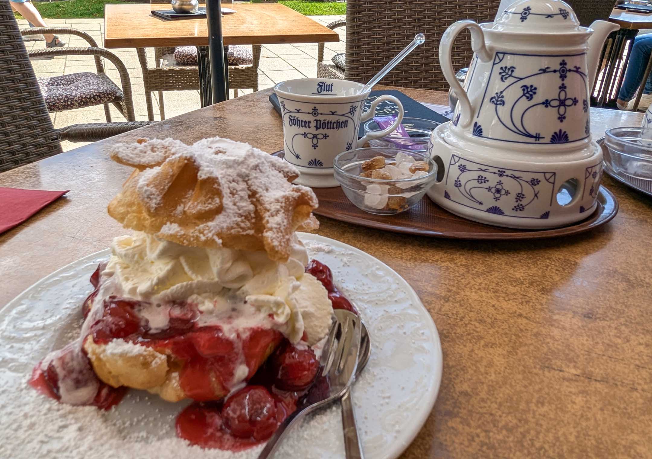 Am Hafen in Föhr gastierte der sonntägliche Markt mit Fressbuden, wo wir uns eine Ladung angeblich holländischer Poffertjes gönnten, die leider nicht genug durchgebacken waren, sondern nach flüssigem Teig schmeckten.