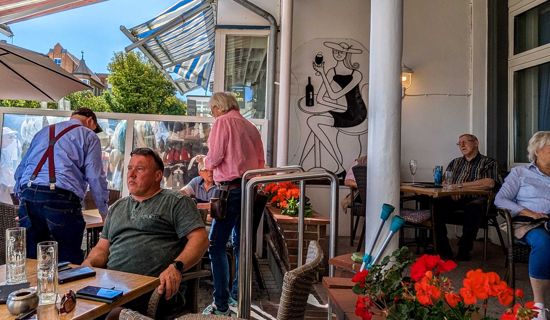 Bis in das Jahr 2005 reicht unsere Erinnerung, dass bei Bübchen’s Milchbar die begehrten Windbeutel im Programm sind. Und nicht nur das, es gab auch einen Platz im Schatten. Ja das muss man sagen, heute wollten alle im Schatten sitzen. Wir gehörten zu den wenigen Glücklichen, die nicht von dem Kerl, der zusammen mit einer (netten) Frau für den Service zuständig war, angeraunzt wurden, weil sie mit ihrem Stuhl, Rollator, Hund, Gehstock, Einkaufstüte so 10 cm zu weit in seinem Durchlaufbereich saßen. Eine Kundin ging daraufhin eingeschnappt wieder, andere stellten ihren Rollator demonstrativ weit genug auf der anderen Straßenseite ab. Der Windbeutel war zwar nur Industrie-Ware, wurde aber frisch aufgeschnitten und mit echter Sahne und heißen Kirschen serviert. Die Referenzklasse an Windbeuteln wurde nicht erreicht. Das bleiben die von „Café am Lotsenturm“ in Timmendorf auf Poel (nicht Timmendorfer Strand). Nach einer Weile ließ sich Bübchen höchstderoselbst blicken. Ein flott gebliebener schlanker Mitt-Siebziger im rosa Hemd, der von Stammgästen begrüßt wurde mit