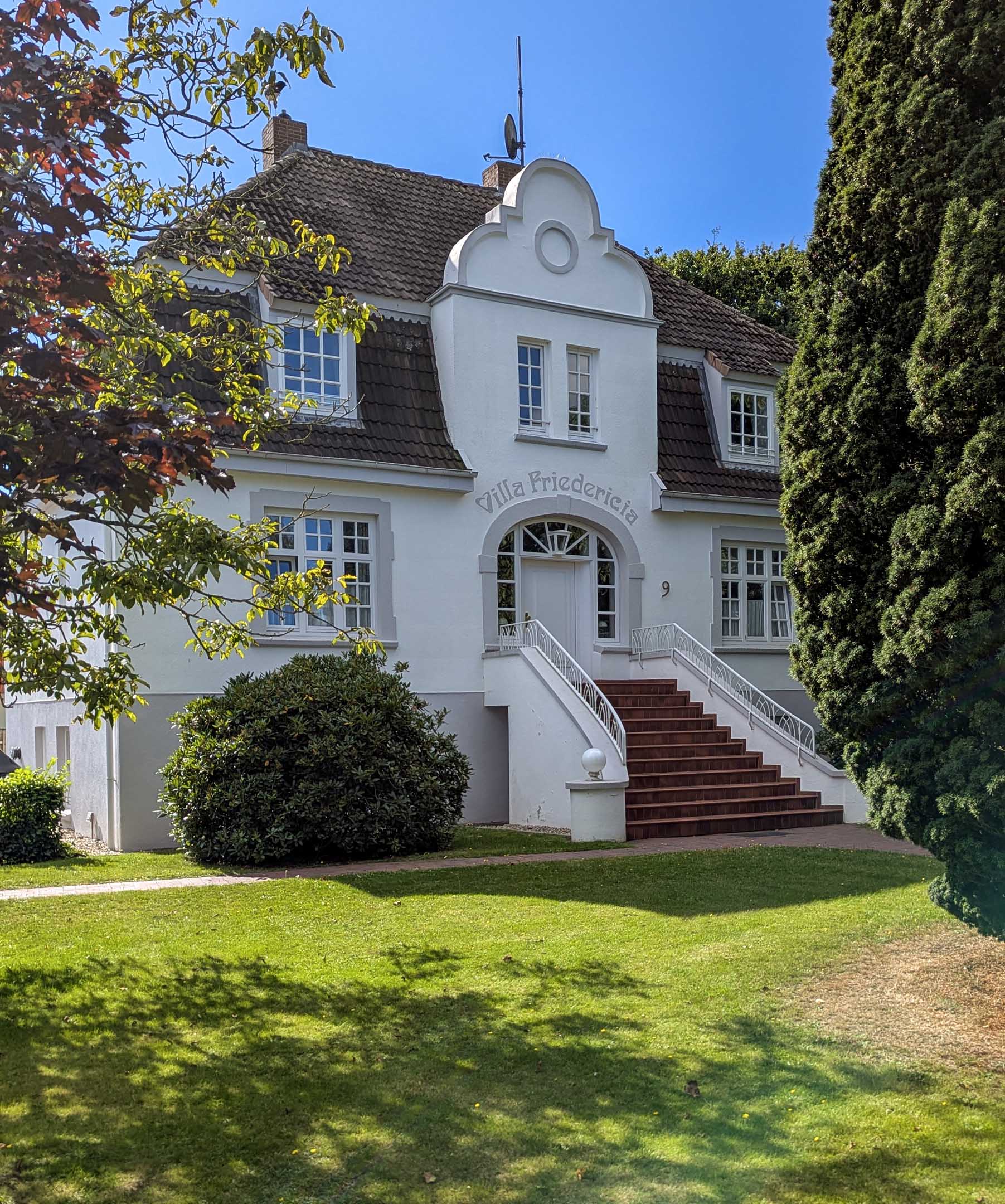 Da hinter dem runtergekommenen Hallenbad Aquaföhr eine Großbaustelle* dazu zwingt, diese weiträumig zu umfahren, kamen wir diesmal durch eine Straße, in der die Liegenschaft »Villa Fridericia« zu finden ist. Uns erinnert sie an den »Barkenhoff« (Heinrich Vogeler Museum) in Worpswede.